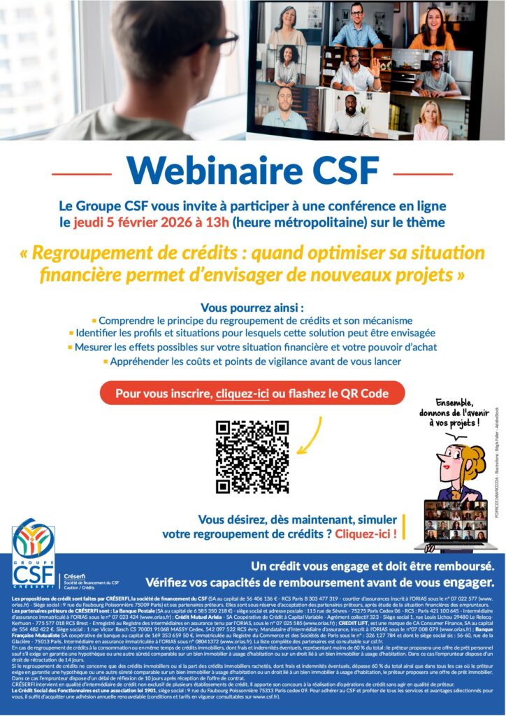 Le 5 février 2026, le Crédit Social des Fonctionnaires(CSF) organise, un webinaire sur les regroupements de crédits ou comment optimiser sa situation financière pour envisager de nouveaux projets.